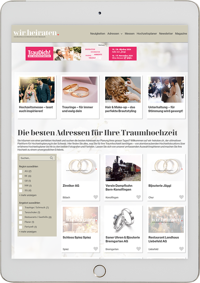 Sie wollen Ihre Produkte und Dienstleistungen einem exklusiven und engagierten Publikum präsentieren? Dann sind Sie bei wir-heiraten.ch genau richtig! Unsere Plattform ist die erste Adresse für heiratswillige Paare in der Schweiz.